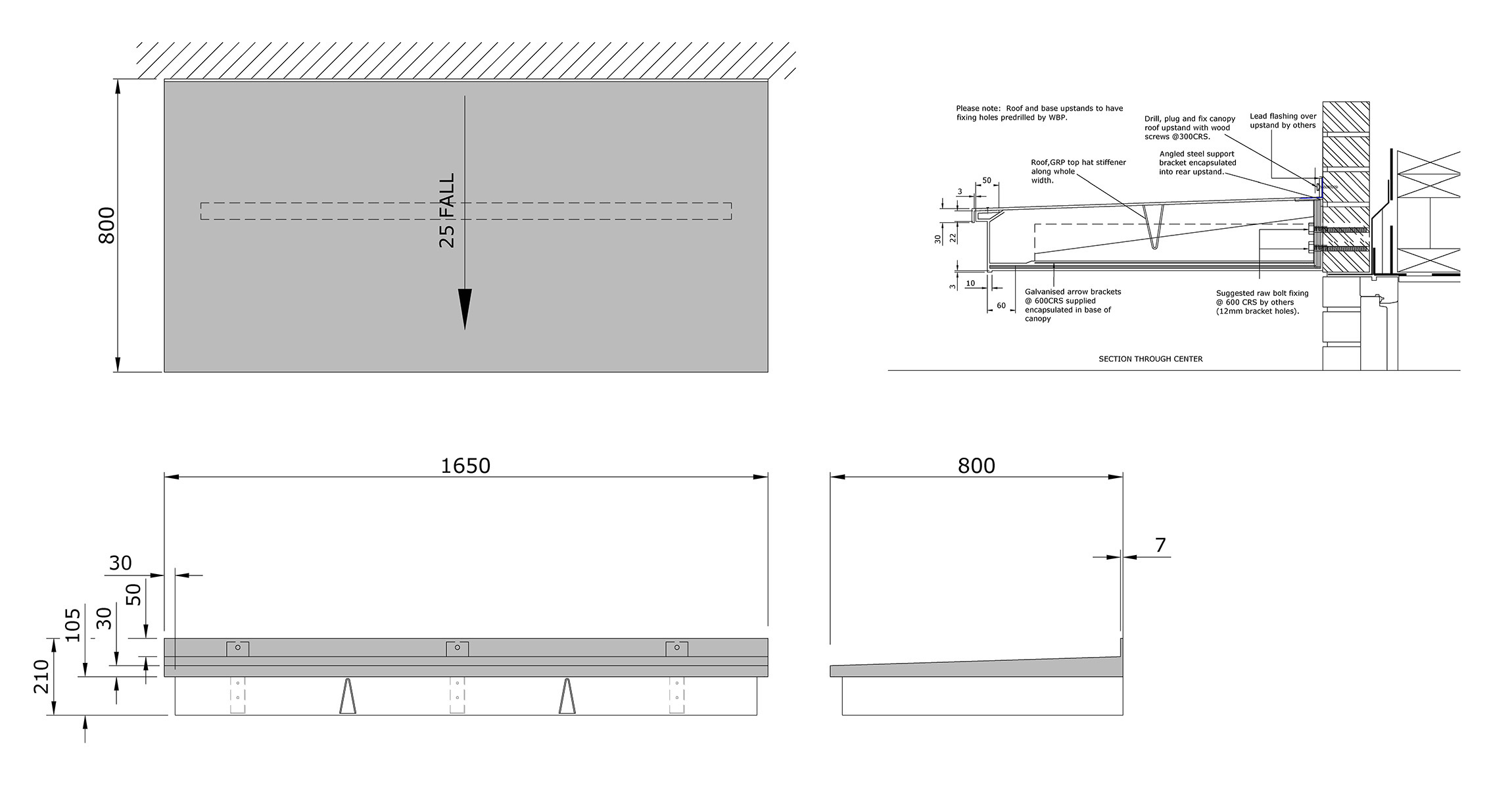 This modern style Wessex door canopy is manufactured from long lasting highly durable GRP. The canopy comes complete with in-built steel anchor brackets which provide and allow a robust and concealed fixing arrangement. Maintenance of your Wessex entrance door canopy is not required apart from occasional cleaning to remove any dirt or grubby marks with a damp cloth and household non abrasive detergent. Wessex Building Products have been manufacturing entrance door canopies for over 35 years and found that that GRP canopies exposed to the elements and natural light for periods in excess of 10 years do not suffer any significant change in the physical properties of the canopy. Life expectancy beyond 40 years can be expected. Installation of the Wessex GRP entrance door canopy must be carried out in accordance with the Wessex Building Products installation guide.